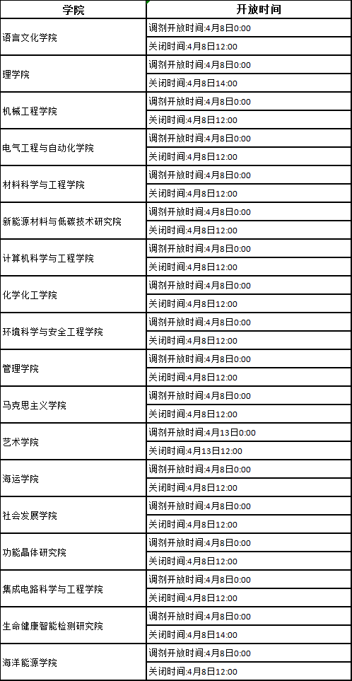 “全国硕士生招生调剂服务系统”于4月8日0:00开启,我校部分专业需要调剂,各学院调剂系统第一轮开放时间如下表所示。