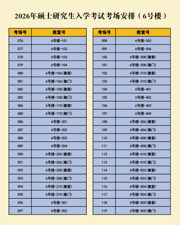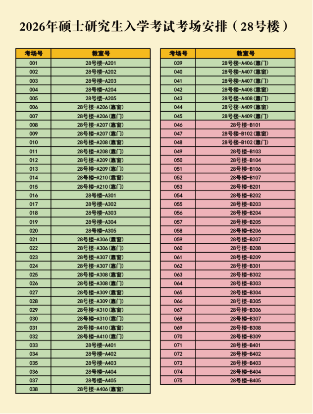 001-075考场设在28号教学楼、076-119考场设在6号教学楼。