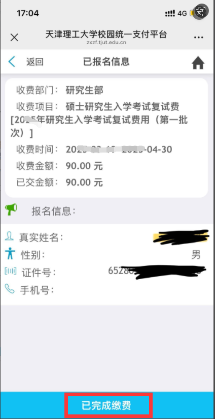 注:若考生无法登录或未查询到缴费信息,请稍后重试。若复试前仍无法缴费,请联系报考学院反馈。校外人员也可通过关注“天津理工大学财务处”公众号“校外缴费”界面进行报名缴费。